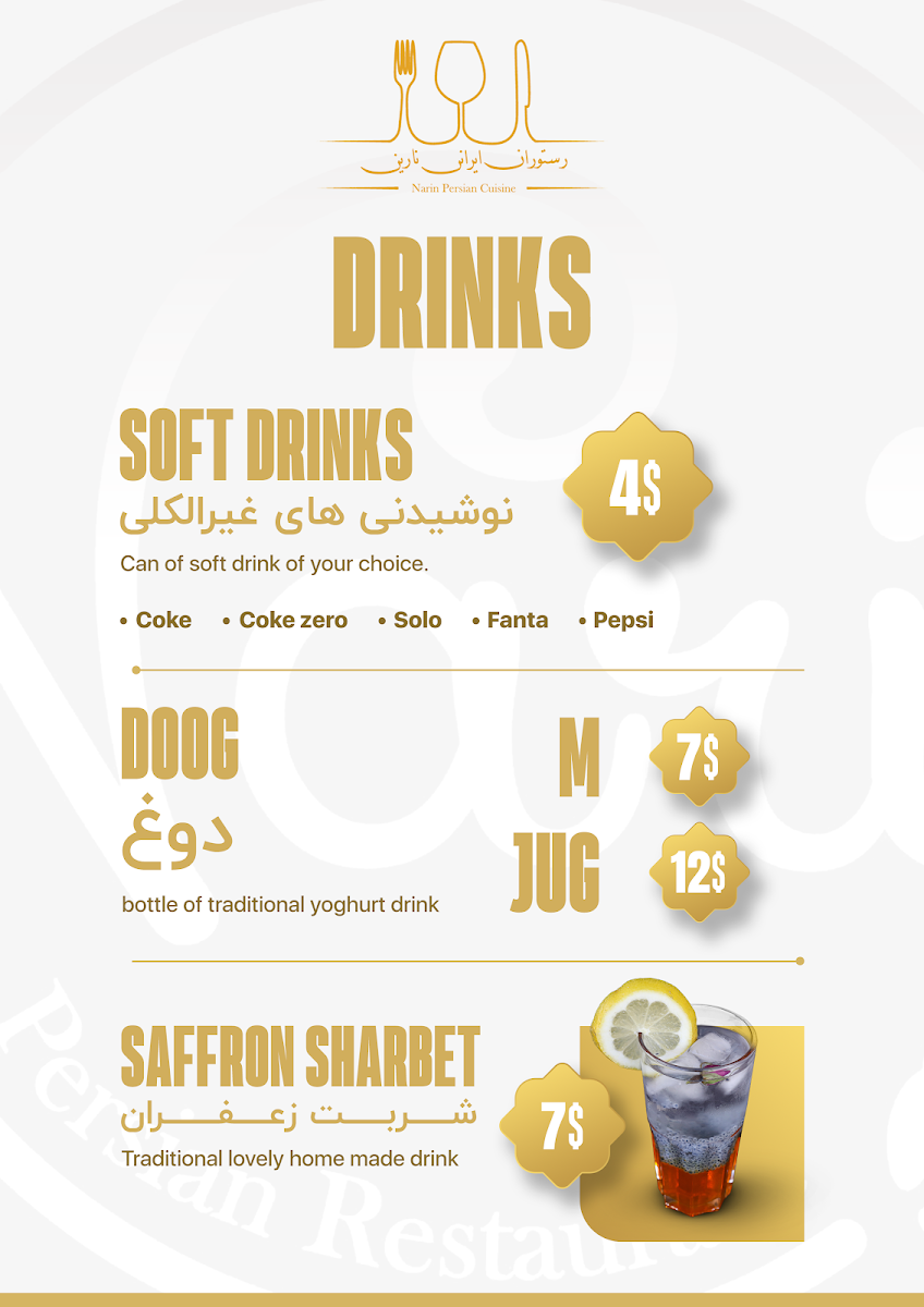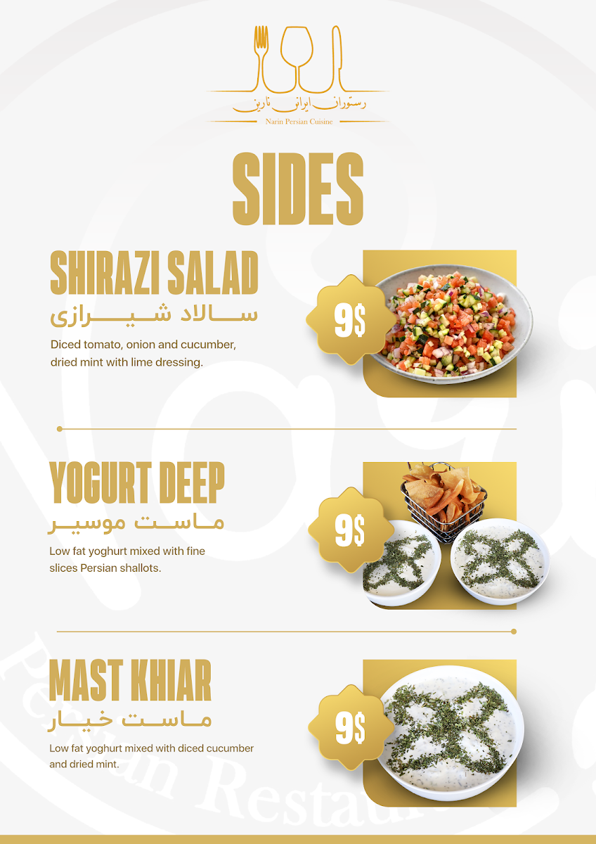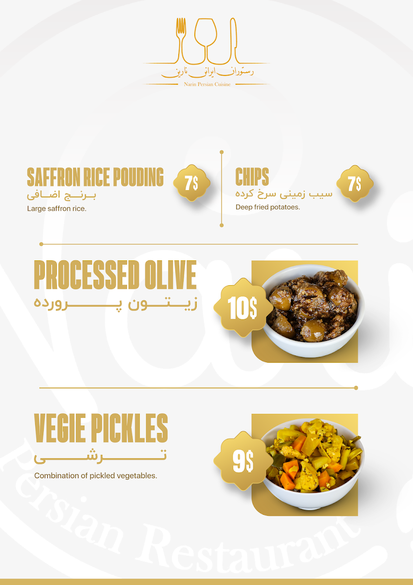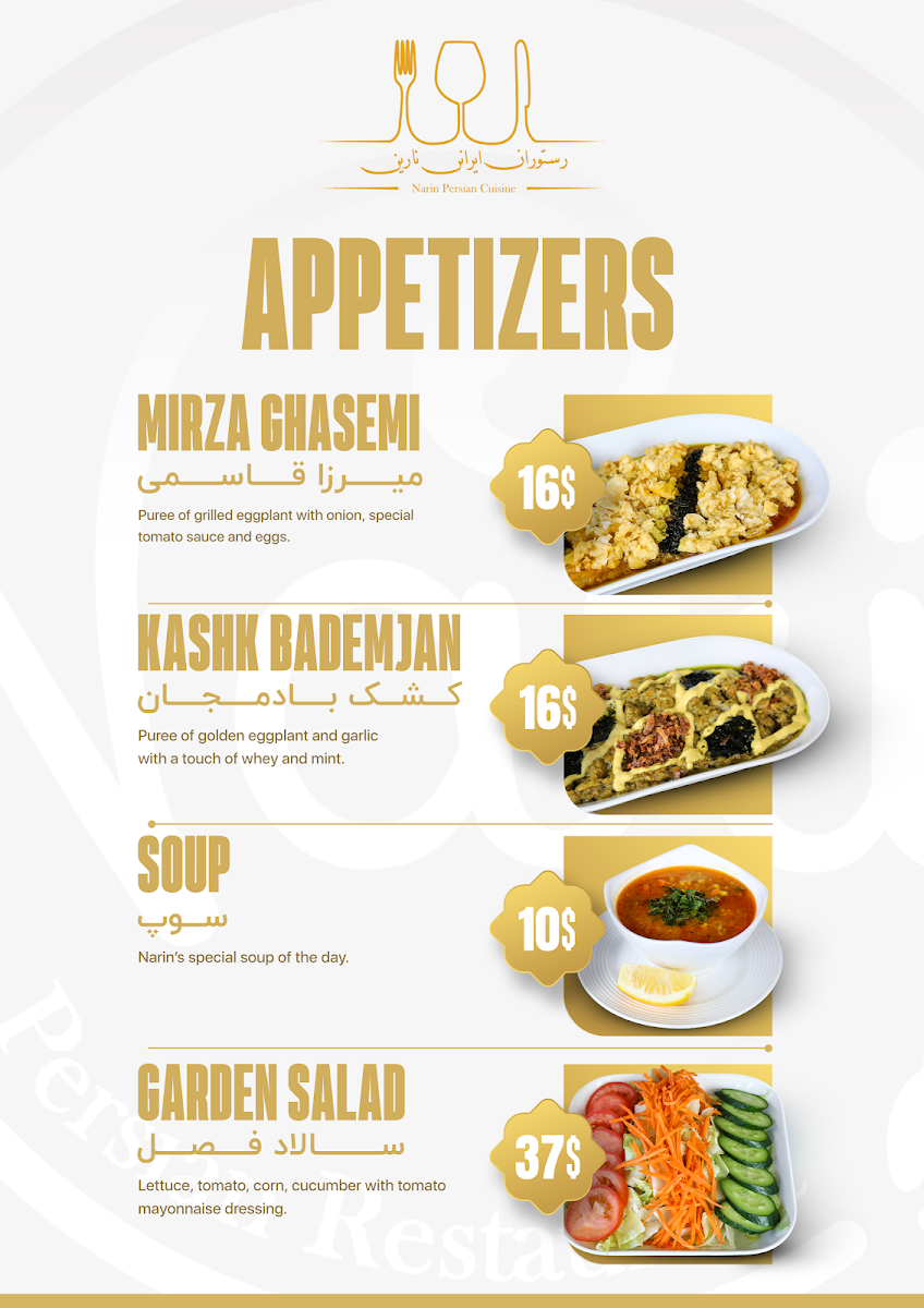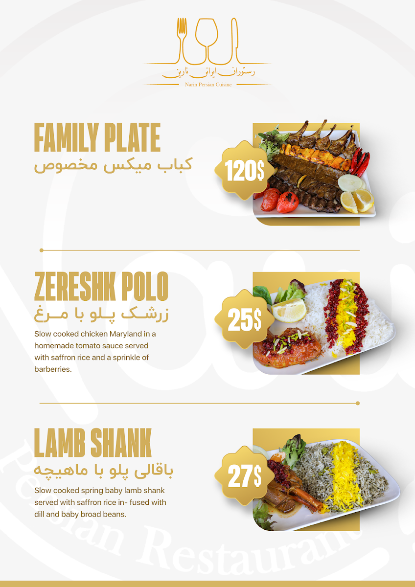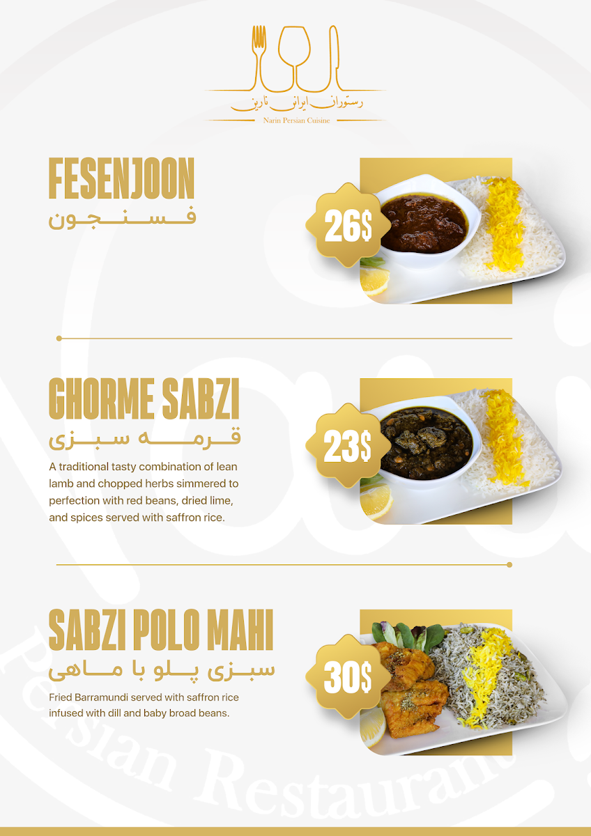 The menu also features delights like ash reshteh and haleem, both popular for their comforting warmth and richness. Each plate is crafted with care, adorned with fresh herbs and spices, providing an elegant touch to your dining experience.